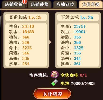 手机拿铁咖啡和电池可以培养女仆,升级女仆后就可以获得属性提升。