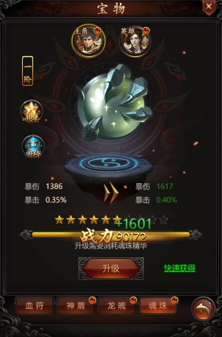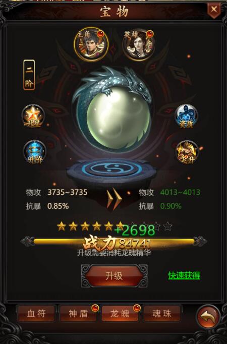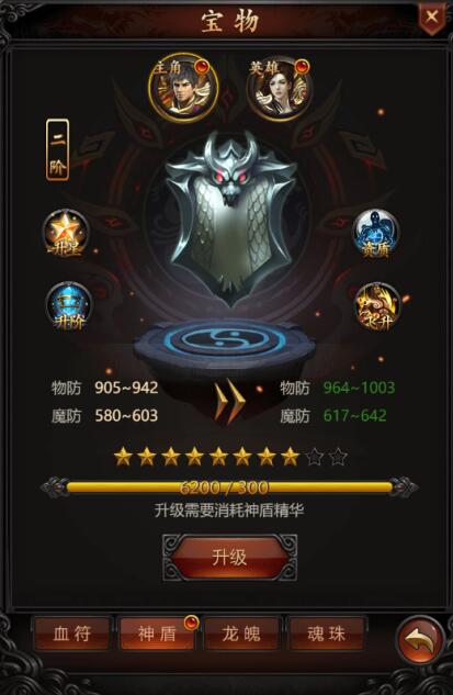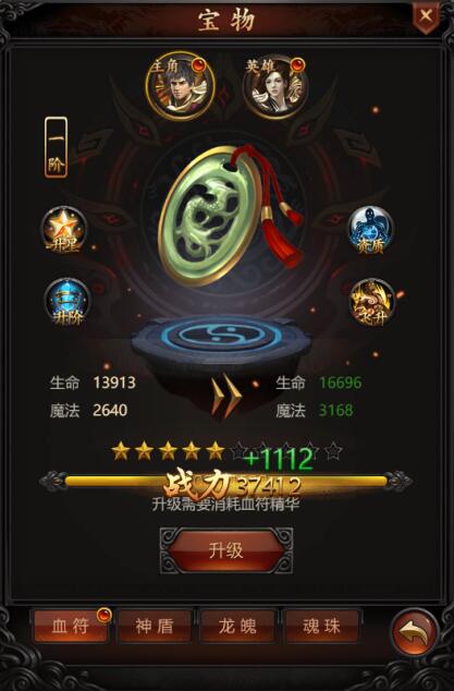 宝物系统由血符、神盾、龙魂、魂珠四大板块形成