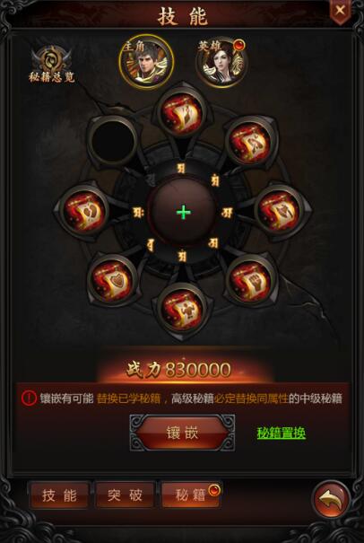 每个角色可佩戴最多可佩戴8种不同的秘籍,等级越高可开启的孔槽就越多