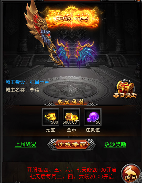 1、每周二、四、六晚上八点开始,八点半结束。如果是新服的话,将会在开服的第四天开启第一次沙城争霸,其后第五、六、七天也会进行攻城活动。
