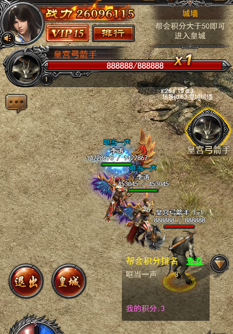 2、沙城一共分为三个场景,玩家在场景中击杀敌对公会玩家或者弓箭手可获得积分,帮会积分达到一定数值,该帮会玩家可点击左下角按钮进入下一个场景。