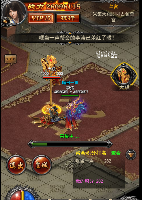 3、进入到最后一张地图,也就是皇宫的时候,玩家需要采集大旗,如果没有看到大旗请稍等,大旗需要活动开启10分钟之后才会出现,其他玩家可以攻击正在采旗的玩家,打断他的进度。