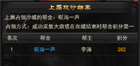 2、活动期间没有帮会采集皇旗,那么等活动时间结束之后,参与攻沙积分最高的帮会将会成为占领者。