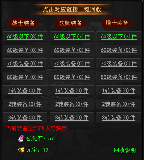 一转级装备回收可得元宝*80、强化石*240