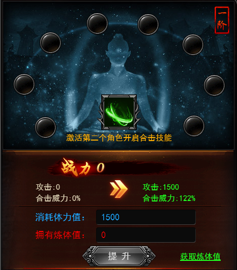 炼体功能38级开启,不仅能增加三角色的攻击属性,在召唤出第二个小伙伴后,还附赠一个强大的合击功能。