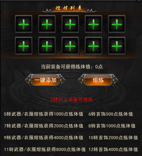 1、5转武器、衣服熔炼获得1000点炼体值、6转首饰500点炼体值