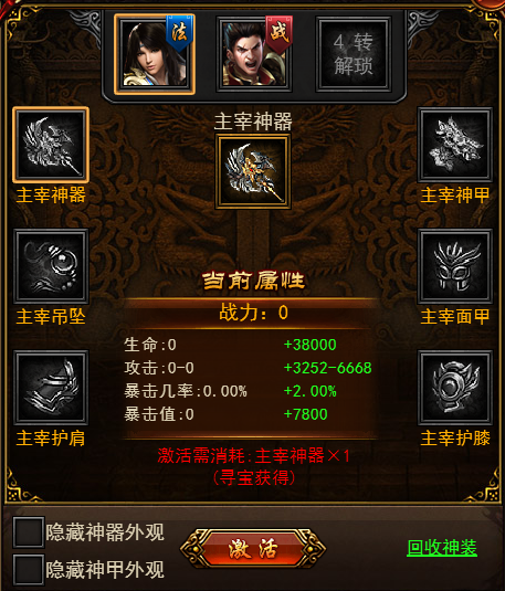 神装共有六个部位:神器、神甲、吊坠、面甲、护肩、护膝。每个部位都为角色增加大量的属性。