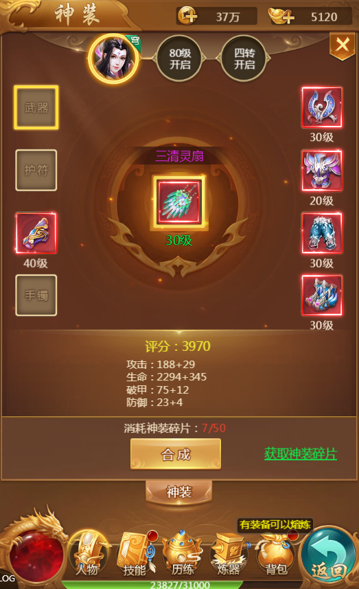 神装可通过打boss、寻宝、神装碎片合成等途径获得,点击【人物】→【角色】→【神装】,即可看到合成界面