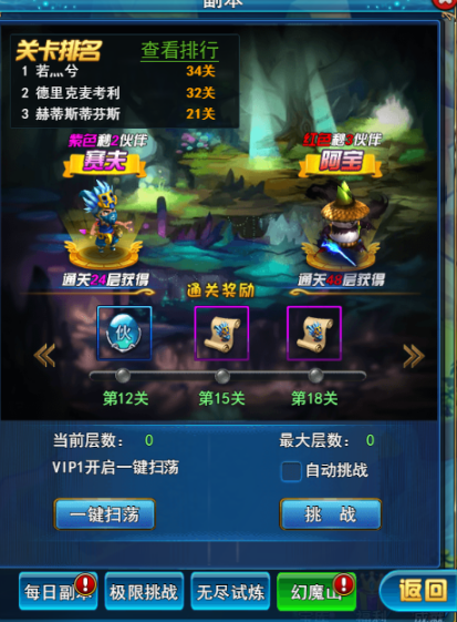 《梦幻仙境》拥有四大副本系统,分别是每日副本(每日资源产出)、极限挑战(宠物升级丹、宠物碎片)无尽试炼(宝石、橙装)、幻魔山(伙伴碎片)。玩家每次通过副本还能获得超级额外奖励呢~