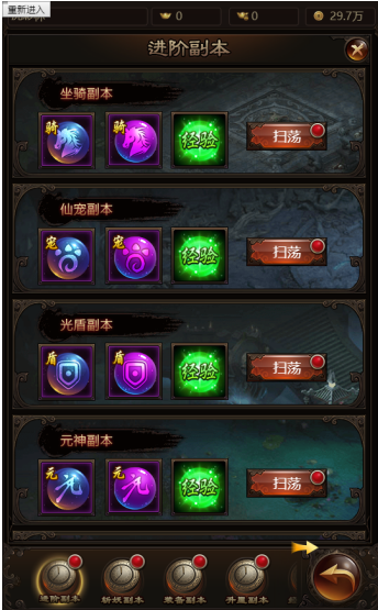 • 进阶副本包括:坐骑副本、宠物副本、元神副本、光盾副本、灵武副本、灵羽副本。