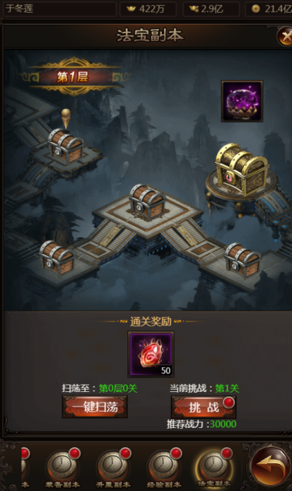 • 法宝副本的一键扫荡功能可以直接扫荡到前一天最高通关的关卡。