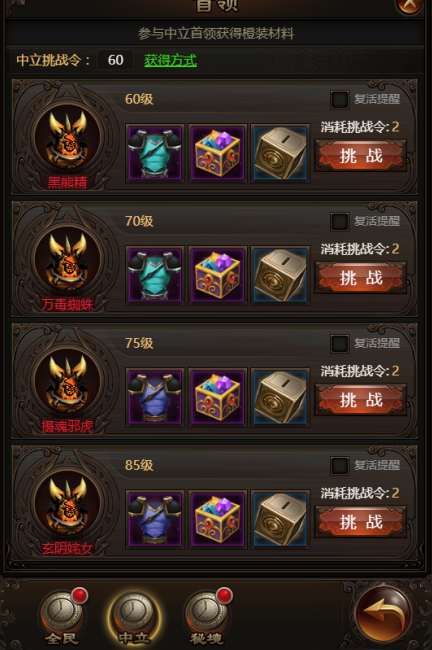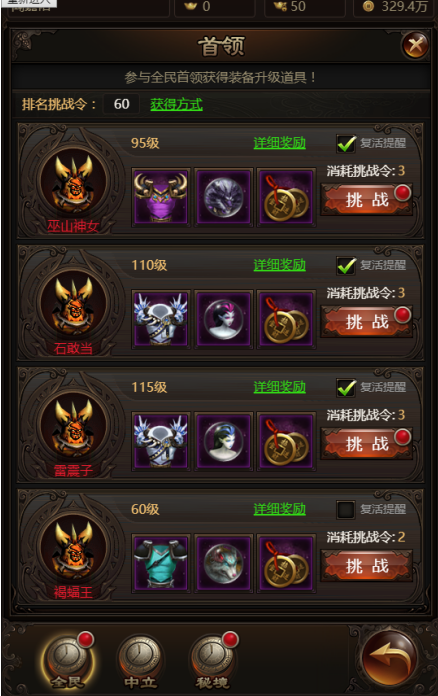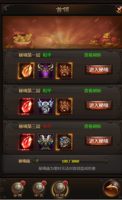 • 全天开放。秘境分3层,前2层为安全区域,第3层为自由决斗区域。伤害值最高的玩家获得首领的归属权,首领死亡时,归属者将获得大量的奖励。