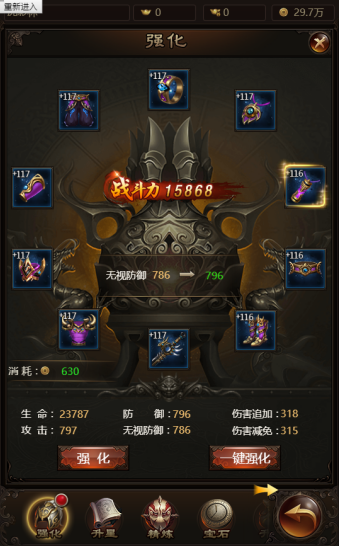 • 装备强化:消耗铜钱可以提升装备的强化等级,提升属性。