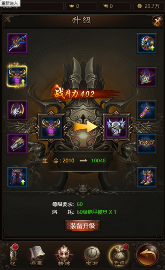 • 装备升级:消耗升级道具可以提升道具的等级。