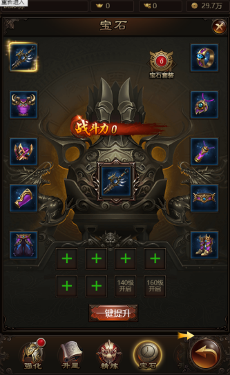• 宝石镶嵌:每件装备上有8个镶嵌孔,一件装备唯一对应镶嵌一种宝石。宝石可以升级,不可卸下。