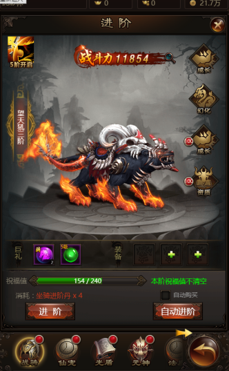 • 坐骑进阶:使用进阶丹提升祝福值,祝福值达到目标值可以进阶。每次进阶可以改变坐骑外形,并提升玩家大量的属性;