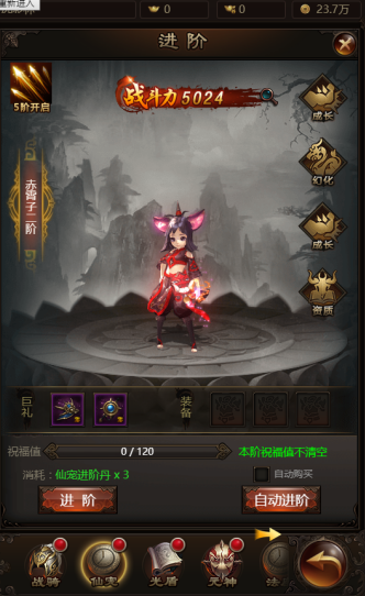 • 仙宠进阶:使用进阶丹提升祝福值,祝福值达到目标值可以进阶。每次进阶可以改变仙宠外形,并提升玩家大量的属性;