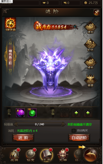 • 光盾进阶:使用进阶丹提升祝福值,祝福值达到目标值可以进阶。每次进阶可以改变光盾外形,并提升玩家大量的属性;