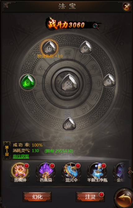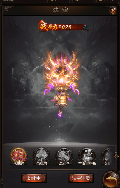 • 法宝:使用道具可激活法宝,已激活的法宝注灵可提升阶级。大幅度提升玩家属性。