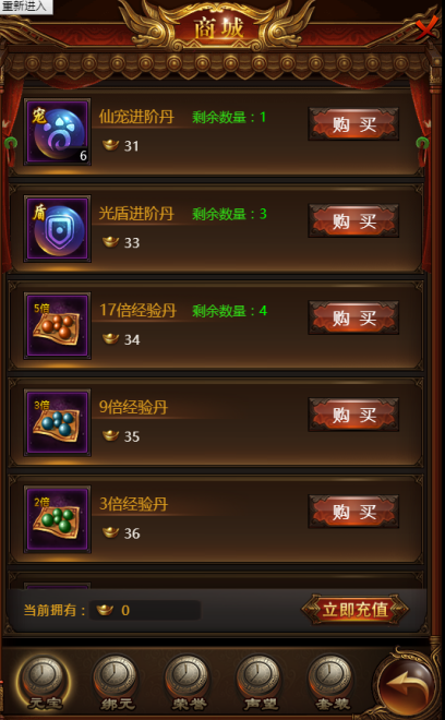 商城分为:元宝商城、绑元商城、荣誉商城、声望商城、套装商城。