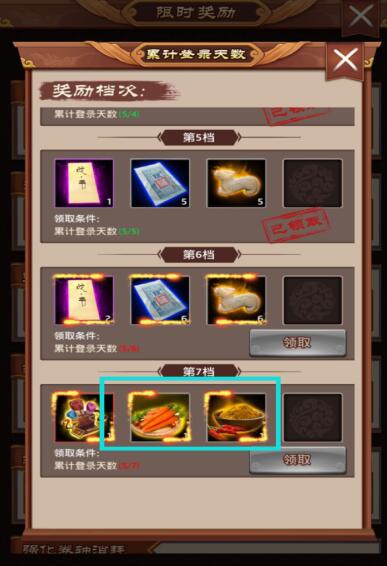 限时奖励。在限时奖励中的累计登录天数中也可以获得宴会材料,此种情况千万不能放过哦,