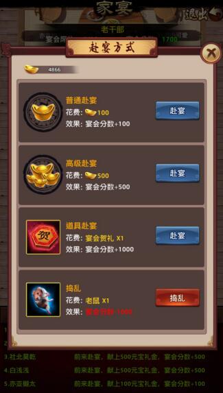 然后选择参加的赴宴方式,参加宴会可以获得和礼金等额的积分,同时有几率获得家宴食材。注意!这边的老鼠捣乱可是会让对方宴会分数-1000点。