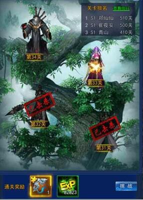 这里是仙战苍天树的主界面,可以看到当前关卡与后一关关卡的BOSS是谁,以及当前关卡通过后获得的奖励是什么。比如这里33关通关就会获得护符碎片。