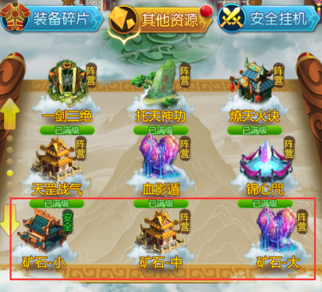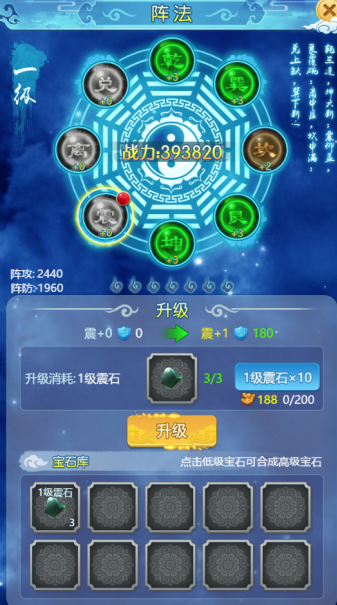 2.使用不同的矿石升级阵法的不同部位,提升战力