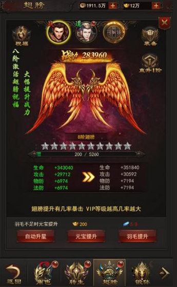 1、羽翼可以使用元宝或者羽毛提升等级。