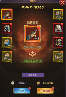 装备的强化在游戏中的“锻造”系统中进行:消耗铜钱和强化石对装备进行强化,强化后可大幅提升角色的攻击力和生命值属性。