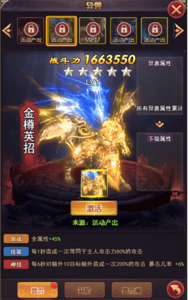 《修真界》世界中仙魔当道,自然也少不了法力高强的得道异兽,各位修士若可获得异兽将极大的提升自己的实力!同法宝一样,异兽同样分为:蓝、紫、橙、红、金5种品质,品质越高实力越强横。异兽除了可以给主人带来属性提升外,还拥有自己的技能,紫色及以上异兽还拥有神技!目前异兽的获取方式大致分为:活跃宝箱获取、VIP等级获取、游戏内活动获取以及在“异兽阁”通过兽魂来购买。