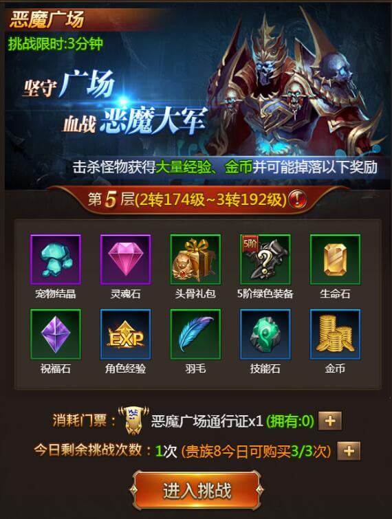 勇士们等级达到相应区间可以提升对应的恶魔广场的层数,层数越高,奖励越丰富。勇士们需要在战斗过程中以最快速的击杀怪物作为自己的主要目标。