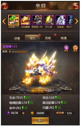 坐骑系统分为强化、洗练、炼魂三大系统,强化坐骑至一定等级后可激发发光流光特效,同时强化存在一定的成功率,失败将消耗材料,强化等级不变。