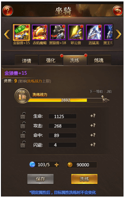 坐骑可通过洗练来随机增减坐骑属性,洗练时可锁定属性(消耗坐骑洗练锁),锁定的属性在洗练时不会变化。