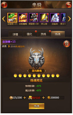 坐骑可进行炼魂,在满阶后可通过炼魂获得大量属性。