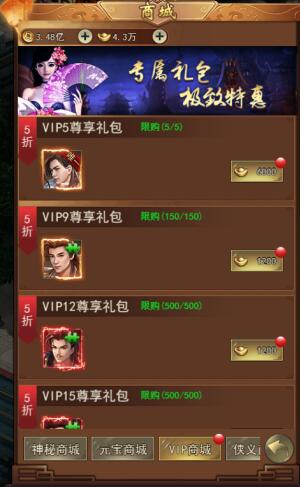 说明 核心消费系统,分为神秘商城、VIP商城、元宝商城、侠义商城、竞技商城以及天外商城6部分