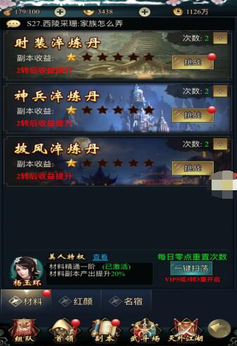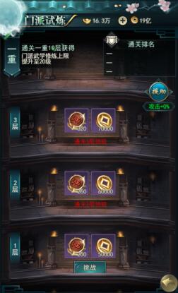 门派试炼 门派弟子可战力验证玩法,通过层层门派的弟子为可赢取积分和金币