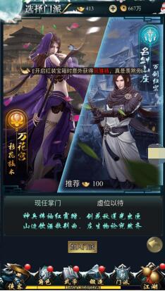 说明 江湖中2大固定门派(阵营):移花宫还有神剑山庄,玩家可自由选择加入其中1个