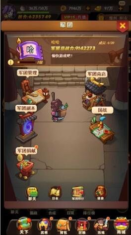 主公等级达到35级时可以开启军团系统,点击国战,加入心仪的军团。加入军团后,可以开启军团管理、军团副本、军团捐献、军团商店、国战、福袋竞猜等功能。参加军团副本、国战和军团捐献可获得军团贡献,军团贡献可用于军团商店购买装备箱、招募令等物资。
