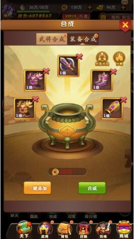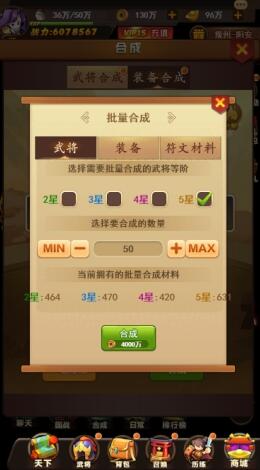 合成系统可以将5个同等级的武将或装备随机合成为1个高一等级的武将或装备。合成会消耗一定的铜币,点击批量合成可以快速地合成武将、装备和符文材料。当主公等级达到90级时可以进行材料的分解。