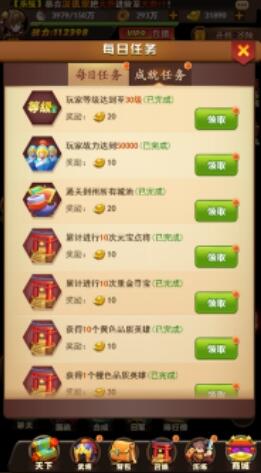 日常任务可在主公等级达到25级时开启,分为每日任务和成就任务。完成每日任务可以获得大量奖励并累积活跃度,当活跃度分别累积到80、130、180、250点时,可以开启道具宝箱,活跃度于每日0点重置。成就任务是当玩家满足一定条件时即可领取奖励,成就任务的奖励只能领取一次。