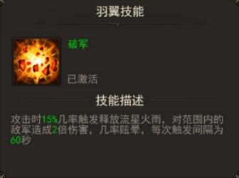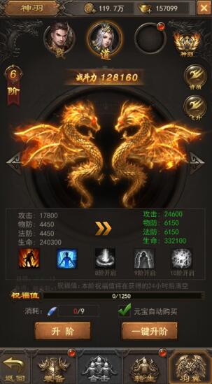 2. 羽翼具有强大的属性和绚丽的外观,羽翼星级达10星即进阶到下一阶,羽翼阶数越高属性越强大,外观越酷炫。
