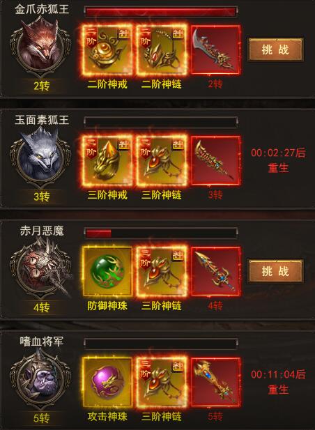 个人BOSS每个等级每天都只能挑战一次,不用多说,最好的办法是尽可能快速提升自己的转生等级,这样每天可以多打一个。转生等级的提升,对于其他几种BOSS来说,也同样实用,转生等级越高,能打的BOSS就越多。
