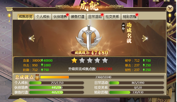 可以记录玩家的点点滴滴,达到指点条件后还可获得绑定元宝和成就点,达到指定的成就点后可以提升成就战力,增加属性提升战力。