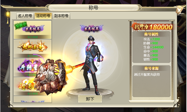 能快速提升属性,达到要求后可直接领取称号,,战力激增。称号可从日常活动中获得,提升实力就是这么轻松!!