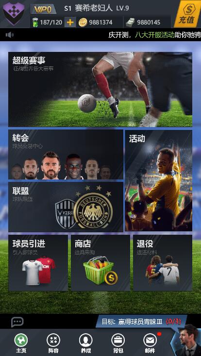 主界面布局简单,一目了然,整体风格比较简约精致,界面的最上方,从左至右依次是玩家的球队队徽、球家昵称、体力值、金币、资金。而在主界面的主要区域,可以看到超级赛事、转会、联盟、活动、球员引进、商店、退役等多个入口。底部则是主页、阵容、养成、背包、邮件等功能入口。
