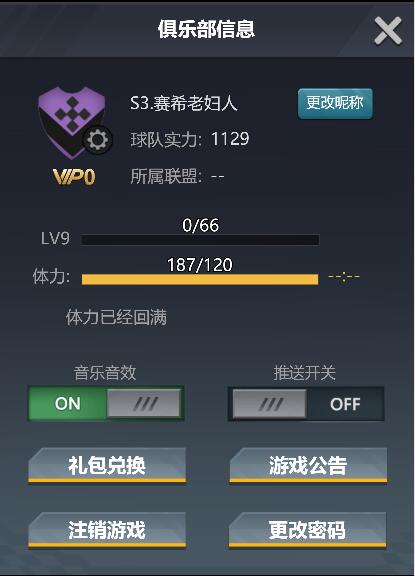 点击玩家队徽后,可以进入到个人信息主界面,包括球队信息、公会信息、游戏公告、礼包兑换,对个人信息一目了然。