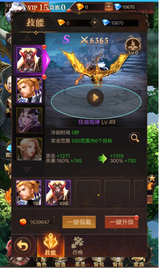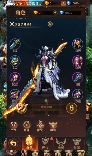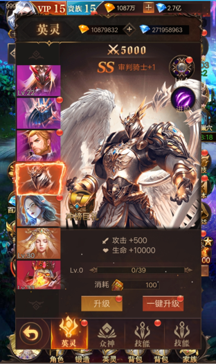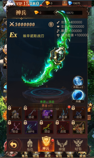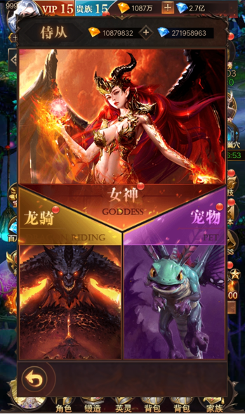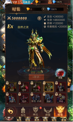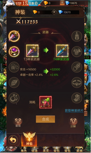 神装:通过消耗红装碎片可以合成各个部位的神装,可以为角色提升属性。