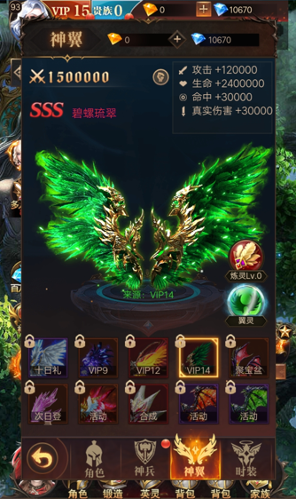 神翼:通过活动或者达成不同的VIP等级条件可以获得形象帅气的神翼,神翼直接展示在角色形象背后,同时为角色增加属性。