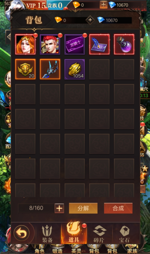 背包存放玩家获得的游戏道具和装备、宝石。玩家可以在背包界面使用物品道具包括礼包,分解或者合成物品。熔炼不需要的装备,转化为锻造需要的强化石和黄金。